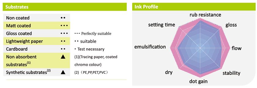 Greentec can run on different types sheetfed offset machines, including perfecting presses, and it can work well on work well with the Alcohol fountain solution and Alcohol-free Fountain Solution. The ink can give best effect on coated paper, matt paper, uncoated paper and cardboard.